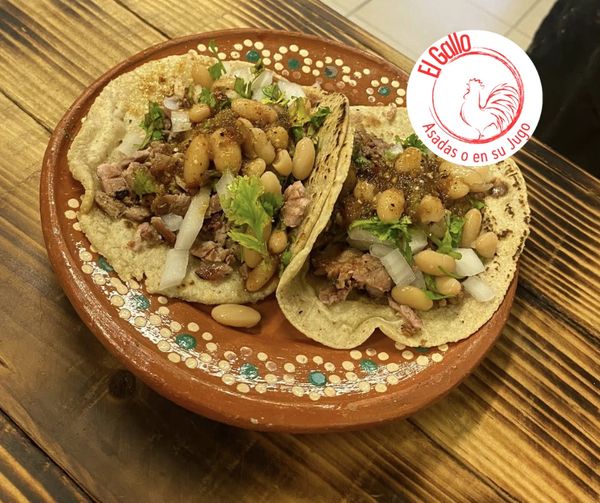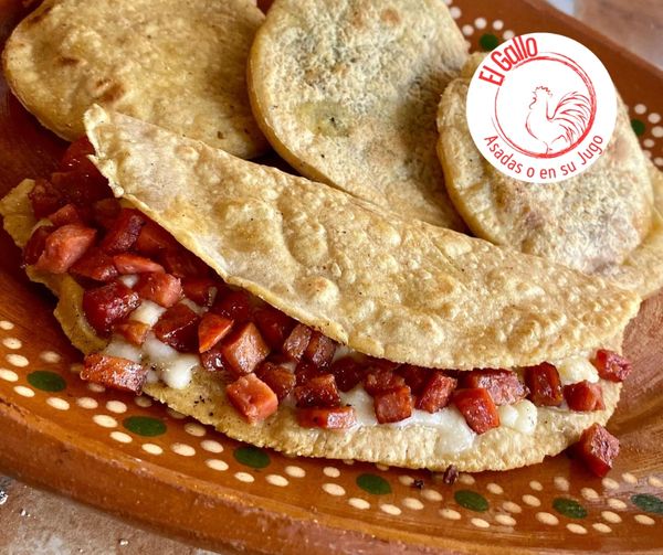 Tortillas de maíz recién hechas con queso adobera y 200grs de carne a elegir (Asada, Arrachera, Chistorra o Chorizo), cebolla asada, salsa martajada, cilantro, cebolla y limón.