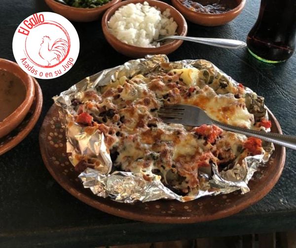 200grs de carne al gusto (Peinecillo, Arrachera, Chistorra y Chorizo) sobre una base de 200grs de papa horneada con mantequilla y pimienta, adobera gratinada, cebollita asada, tortillas y salsa martajada.